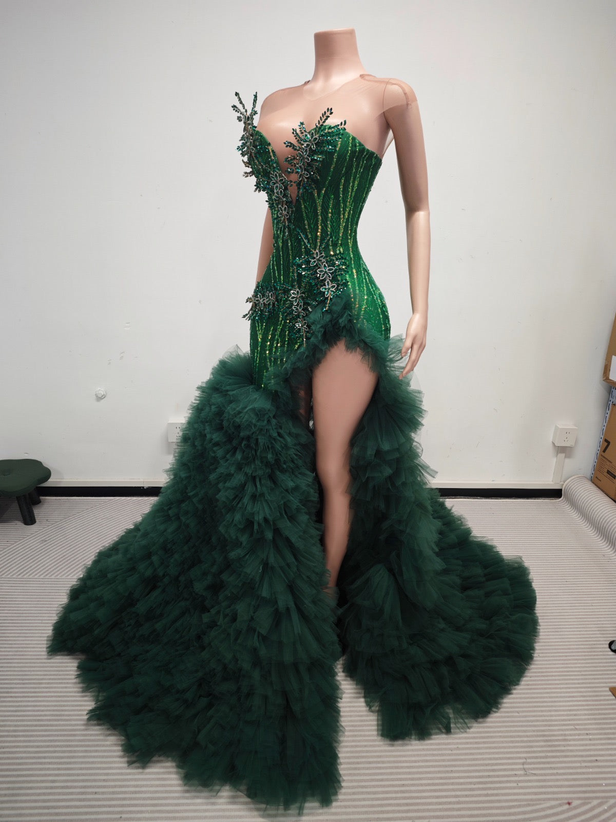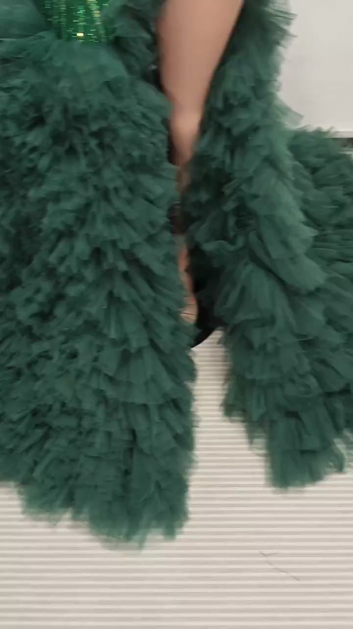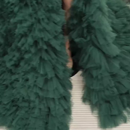 Make an unforgettable entrance in our breathtaking Enchanté Gown, a dramatic couture design created to captivate the room. This show-stopping gown features a sculpted corset bodice adorned with intricate beading and illusion detailing that enhances the silhouette beautifully. The daring high slit flows into layers of voluminous cascading ruffle tulle, creating a luxurious train that moves effortlessly with every step.