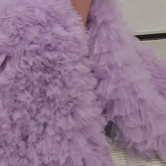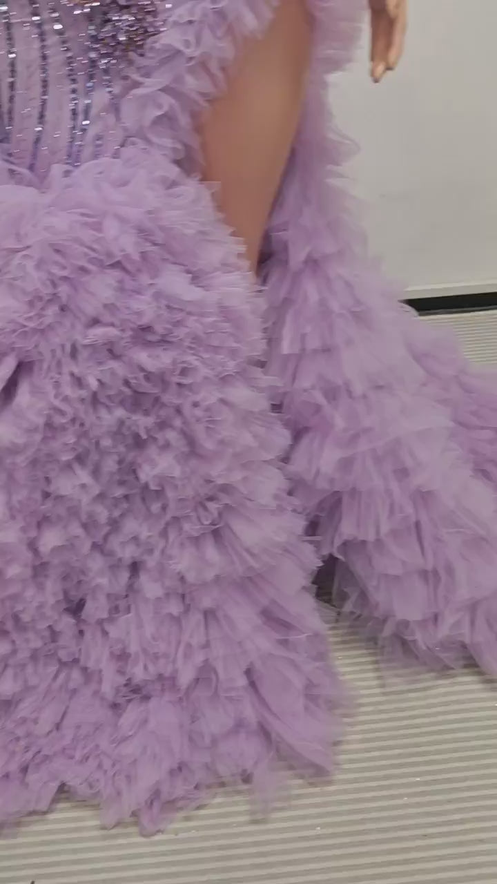 Make an unforgettable entrance in our breathtaking Enchanté Gown, a dramatic couture design created to captivate the room. This show-stopping gown features a sculpted corset bodice adorned with intricate beading and illusion detailing that enhances the silhouette beautifully. The daring high slit flows into layers of voluminous cascading ruffle tulle, creating a luxurious train that moves effortlessly with every step.